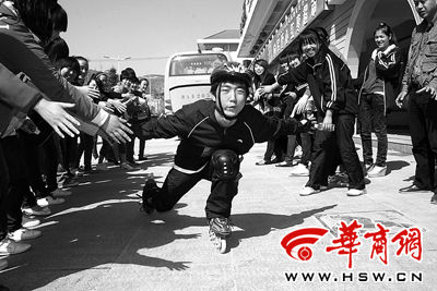 临行之际,同学们为曹天斌送行本报记者 张波 摄本报延安讯“爸,我到西安了。”昨日下午,18岁的曹天斌边打电话边喘着气。22日早上,他从延安出发,脚踩轮滑,计划用三天时间,行程360公里抵达西安。用他的话讲,“我希望以这种挑战自我的方式参加世园会。”