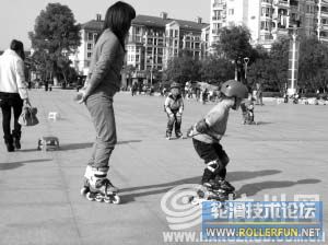 一个坐在花坛边的男子指了指正在玩轮滑的一个孩子说:“我儿子4岁,我们住在三墩,今天第一天来,平时都要上幼儿园,没时间,周末如果呆在家里,就什么也不做了,还不如出来学这个,锻炼锻炼身体,玩玩嘛,他玩了一天了,上午2个小时,下午2小时,很兴奋,我就给他报了个初级班。”